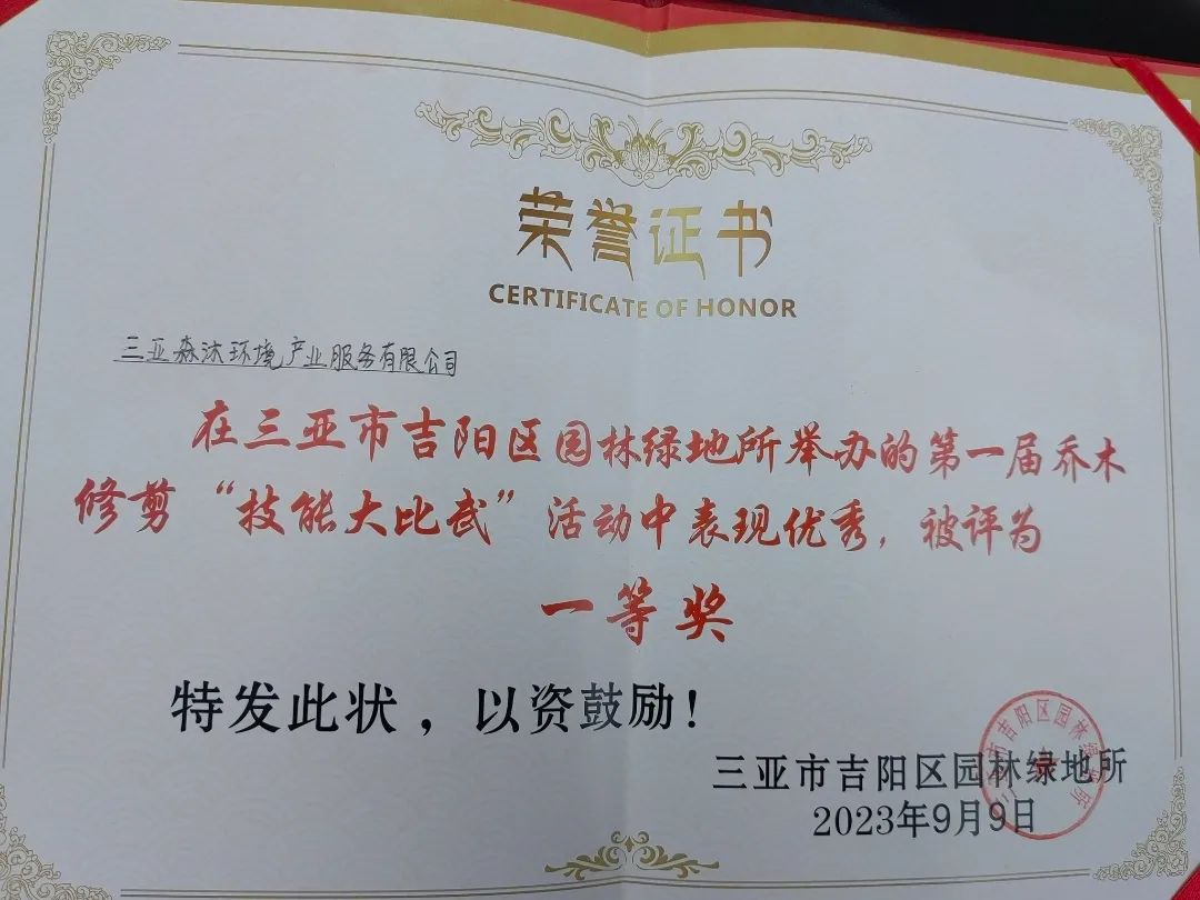 【喜報(bào)】森沐環(huán)境在三亞市吉陽(yáng)區(qū)園林綠地所舉辦的第一屆喬木修剪“技能大比武”活動(dòng)中獲得一等獎(jiǎng)